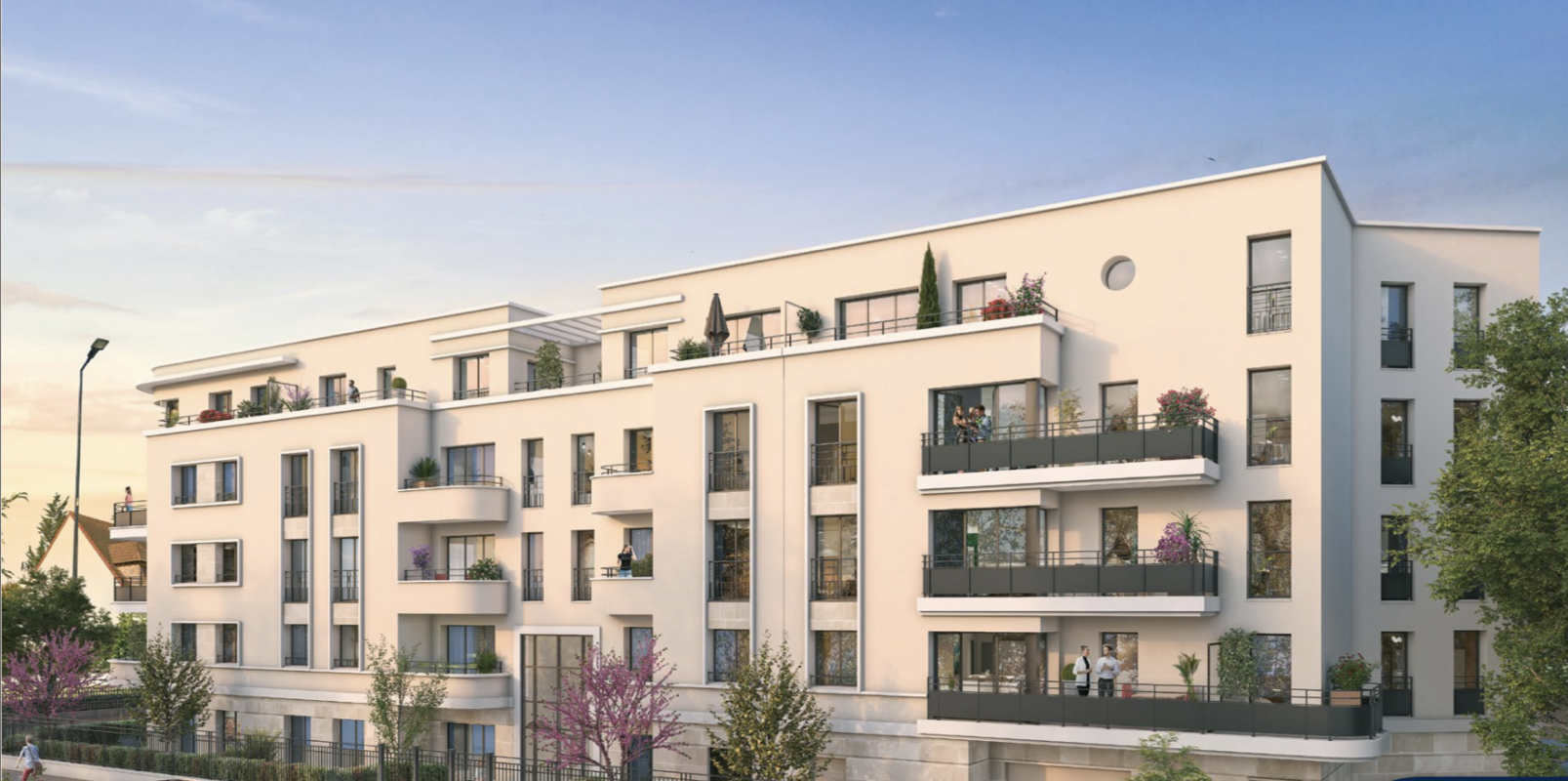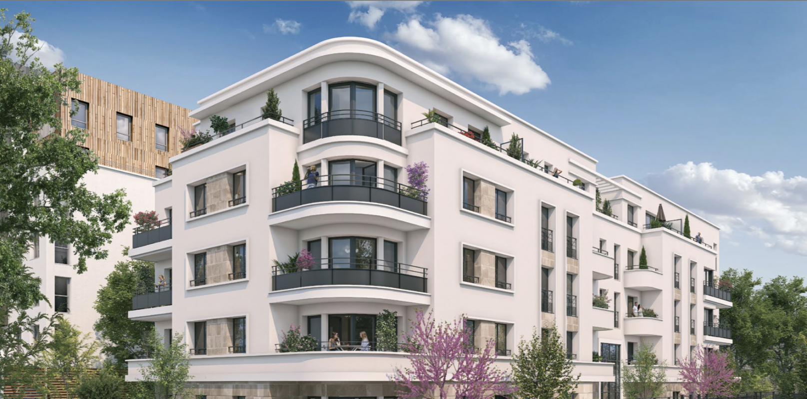 À l’arrière, de beaux jardins arborés constituent un véritable espace de nature. D’architecture sobre et élégante, la résidence s’inspire de l’architecture traditionnelle parisienne. Les façades agrémentées de corniches, modénatures et balcons arrondis art déco, sont mises en valeur par des matériaux de qualité.