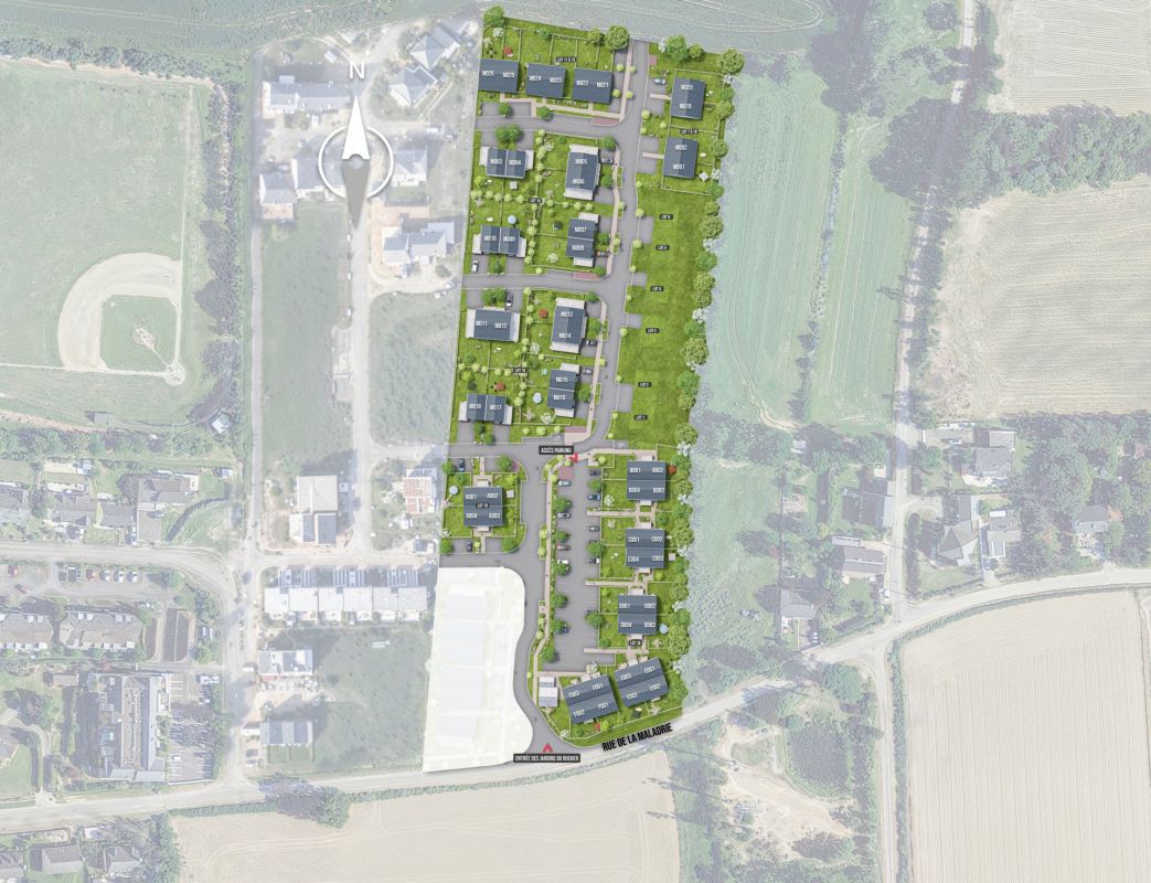 Situé rue de la Maladrie, en plein cœur du bourg de Bréal-sous-Montfort, Les Jardins du Rocher propose 22 logements aux prestations soignées, s’inscrivant au cœur d’une résidence intimiste. Ce nouveau lieu de vie se compose de 10 maisons de plain-pied à partir de 42m², déclinable en 2 pièces ou 3 pièces, ainsi que de 12 appartements-balcons et appartements-jardins de 2 et 3 pièces à partir de 40m². Tous les logements disposent d’un jardin privatif engazonné ou bien d’un balcon, ainsi que d’une place de stationnement. Les maisons, quant à elles, disposent d’un garage et de deux places de stationnement extérieures, donc une réservée aux personnes à mobilité réduite. Implantée au cœur d’un espace arboré généreux, l’adresse offre un cadre naturel préservé, propice au bien-être et à la sérénité au quotidien.