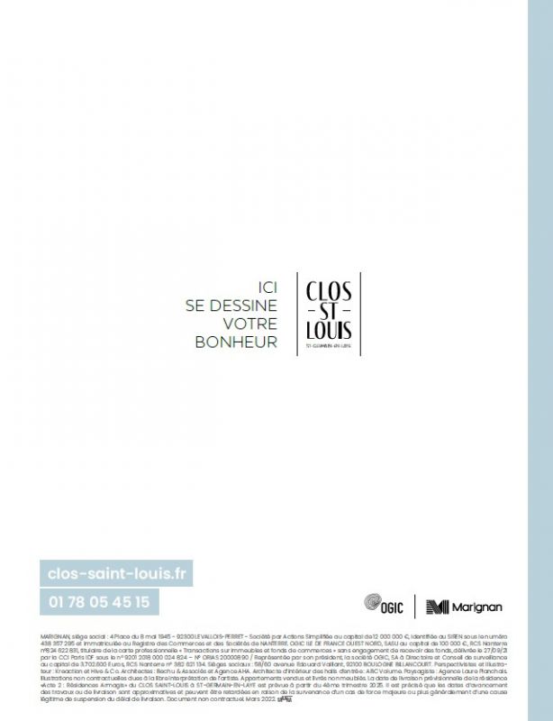 Achetez votre appartement neuf ou votre maison sur les toits à Saint-Germain-en-Laye! Venez visiter notre appartement témoin et vous projeter dans votre futur chez vous !C'est dans la ville très cossue de Saint-Germain-en-Laye que Marignan, en association avec OGIC, dévoilent leur nouvelle réalisation, dans le cadre unique du nouveau quartier "Clos Saint-Louis", créé dans le prolongement du centre-ville, autour de l'ancien hôpital réhabilité. Découvrez les appartements de grand standing de la résidence "Acte II Résidences Armagis", pensés pour offrir des volumes généreux baignés de lumière. Soyez parmi les privilégiés à choisir votre futur bien immobilier, du studio au 5 pièces, à 850 m du RER A.Il fera bon vivre et se promener en toute sécurité dans ce vaste quartier, entièrement piéton et végétalisé, et profiter de l'animation des commerces, restaurants et nombreuses boutiques.Contactez-vite un de nos conseillers pour découvrir tous nos appartements neufs à Saint-Germain-en-Laye !