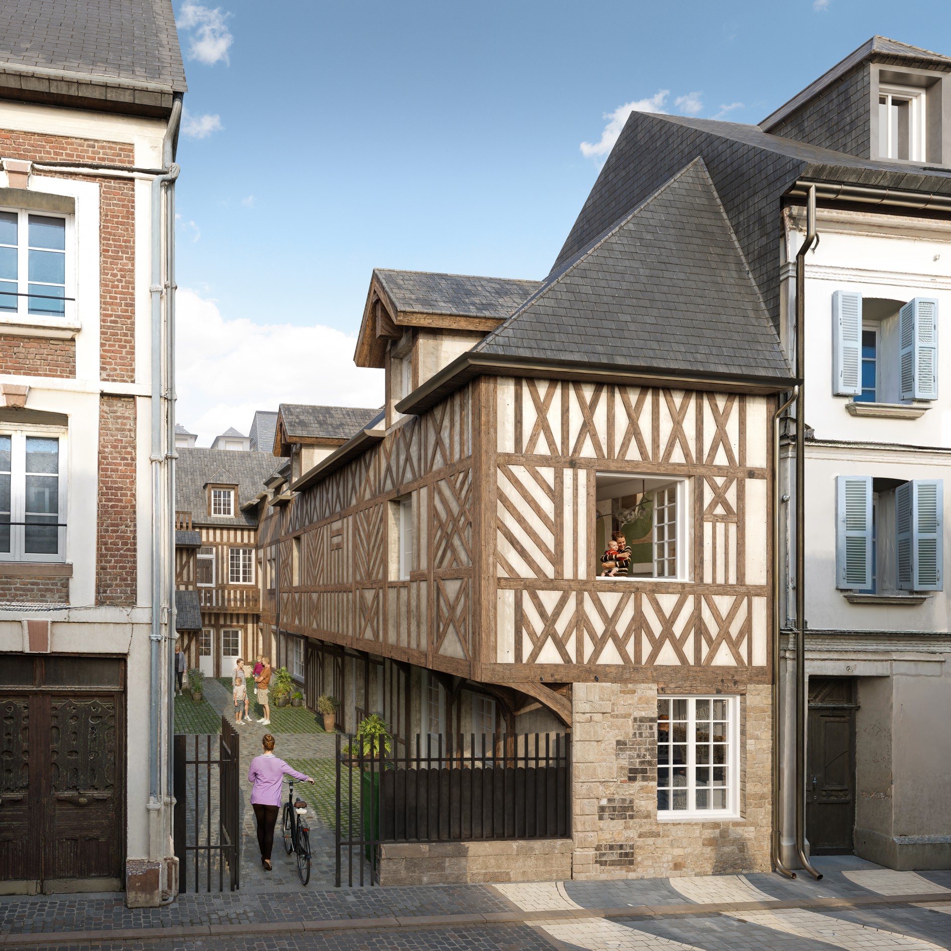 Une rue d'exception : architecture médiévale classée, maisons à pans de bois et pierres.