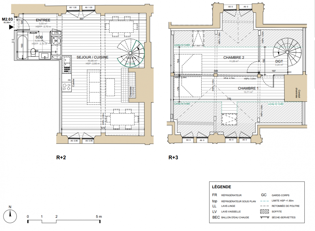 - 2ème étage : 5 logements (1 studio et 4 deux pièces)
