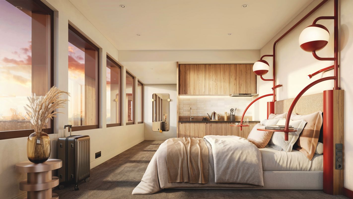 Elle propose 128 logements meublés et équipés ainsi que de nombreux espaces communs : espace coworking, laverie, salle de projection, bagagerie, espace remise en forme....